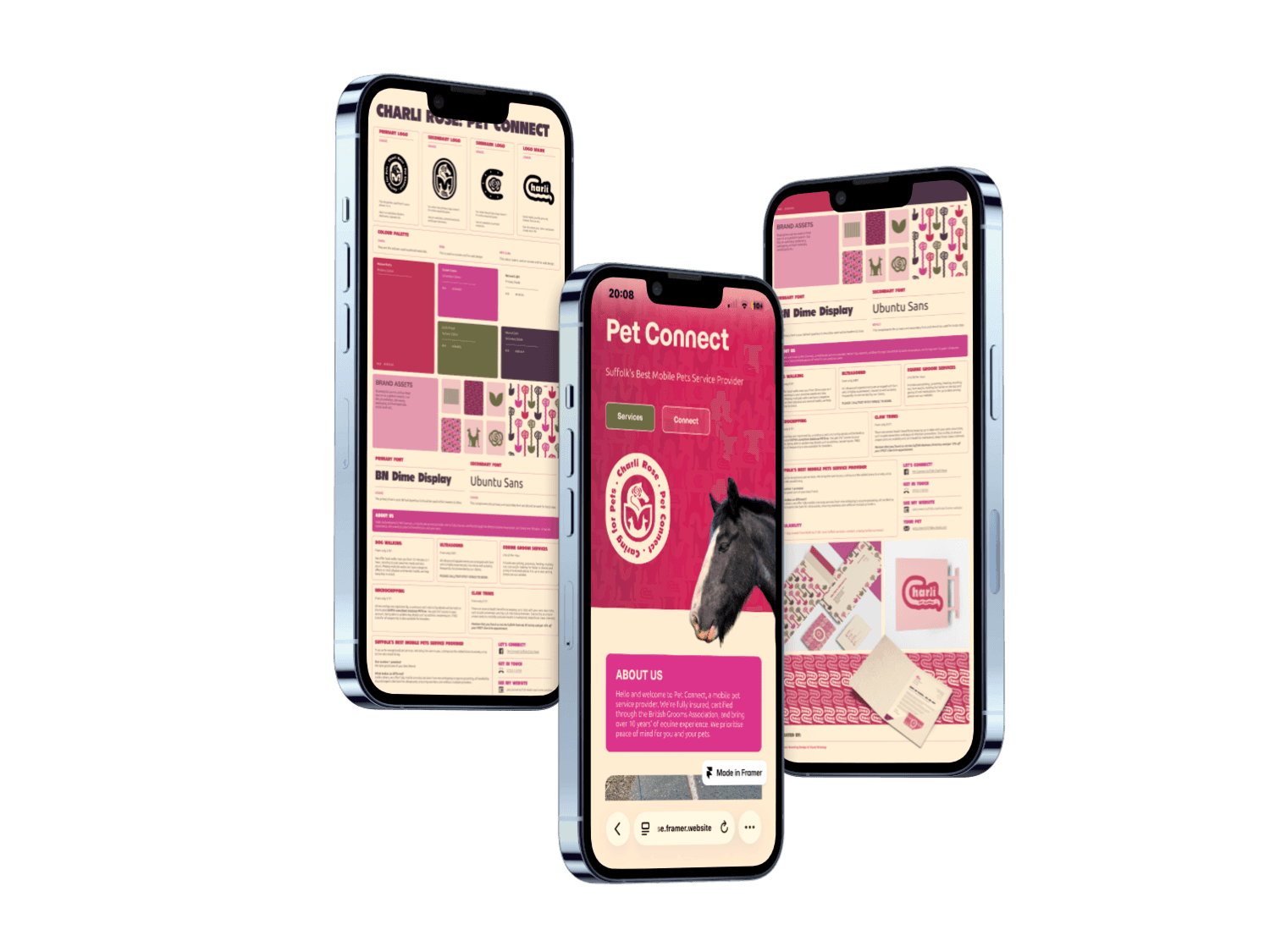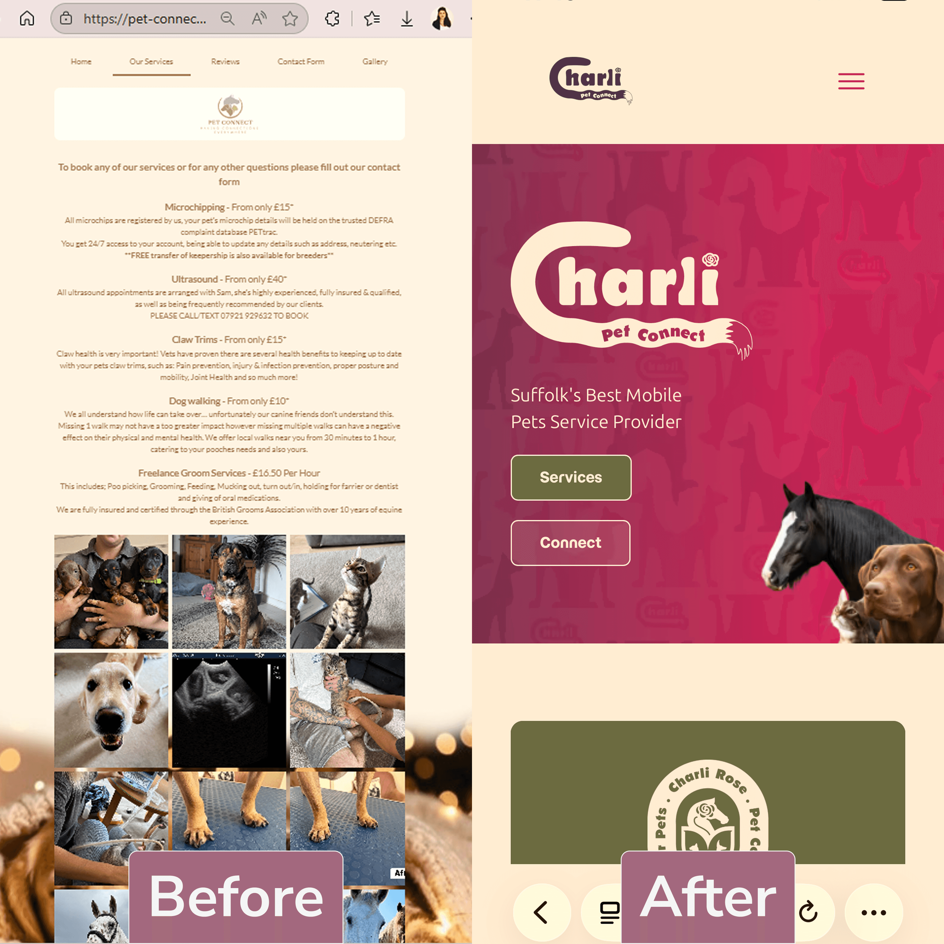 A refresh of an already well-loved pet care business, turning strong but beige content into a bright, personality-led one-page site and brand that feels like Charli, showcases her prices and services clearly, and is easy for pet owners to use on any device.